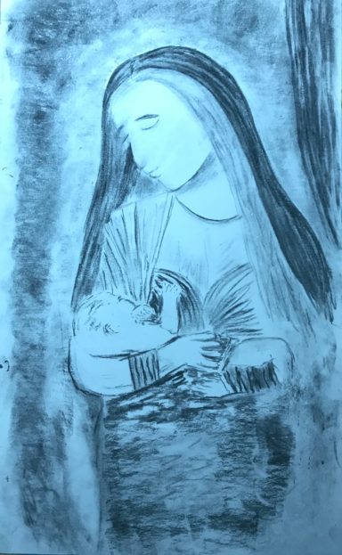 Zeichnungen in Kohle, Bleistiftskizzen und farbigen Bildern.